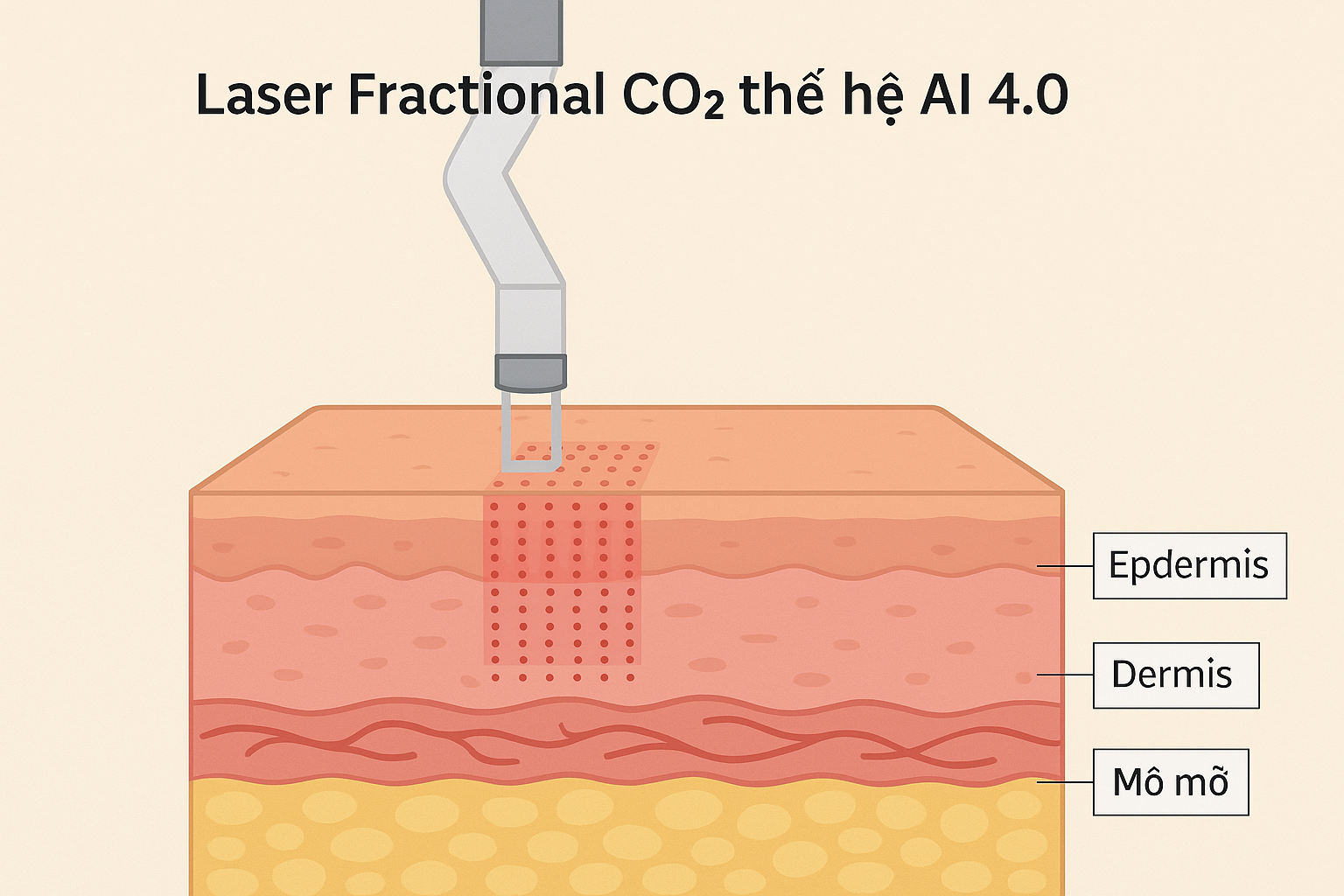 Phiên bản nâng cấp 2025 của laser Fractional CO2 ứng dụng trí tuệ nhân tạo để quét chính xác vùng da bị tổn thương vi điểm, kích thích sản sinh collagen và tái tạo sợi elastin mà không xâm lấn sâu.